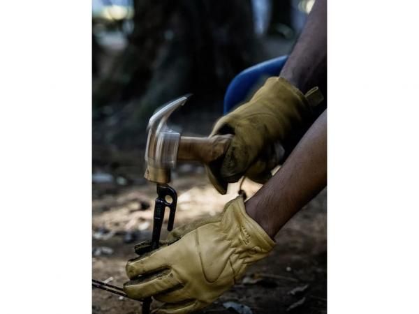 強度と耐久性が高く少ない力でペグを打ち込める一方、打撃の衝撃は吸収し手の痺れを防止。大事なペグも傷付けない。このペグハンマーは、ヘッド部分を真鍮部品を通してハンドルに固定するユニークな方法で、ヘッドの側面にロゴを表現。